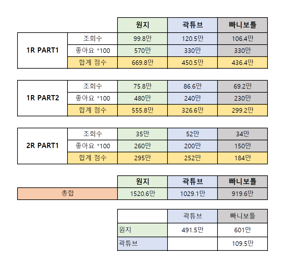 현재 유튜버 원지가 곽튜브와는 490만점 빠니보틀과는 601만점 차이가 나며 선두를 달리고 있습니다. 곽튜브와 빠니보틀은 109만점 차이로 다소 근소한 차이를 보이고 있습니다. 일반적으로 곽튜브의 조회수가 높지만 원지의 좋아요 수가 압도하여 생긴 점수차입니다.